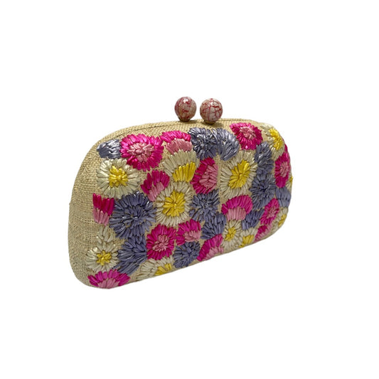Clutch de rafia bordado tonos rosas, amarillo y morado