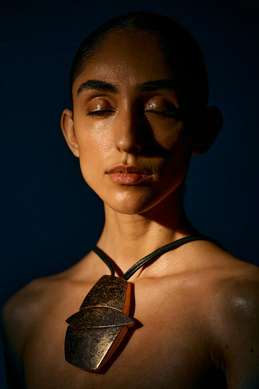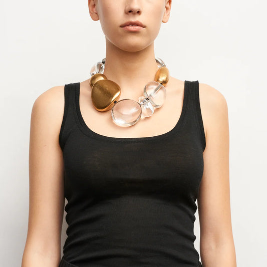 Maxi-Collar Monies acrílico, piel y pan de oro