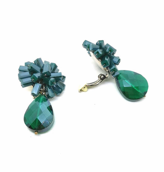 Pendientes gota de cristal y cabezal floral en cristal facetado verde botella