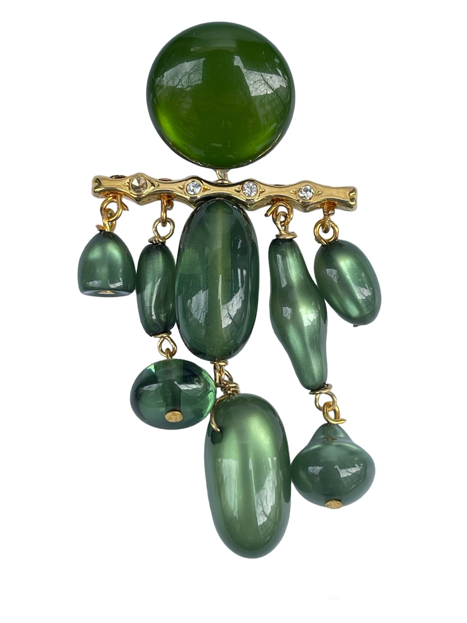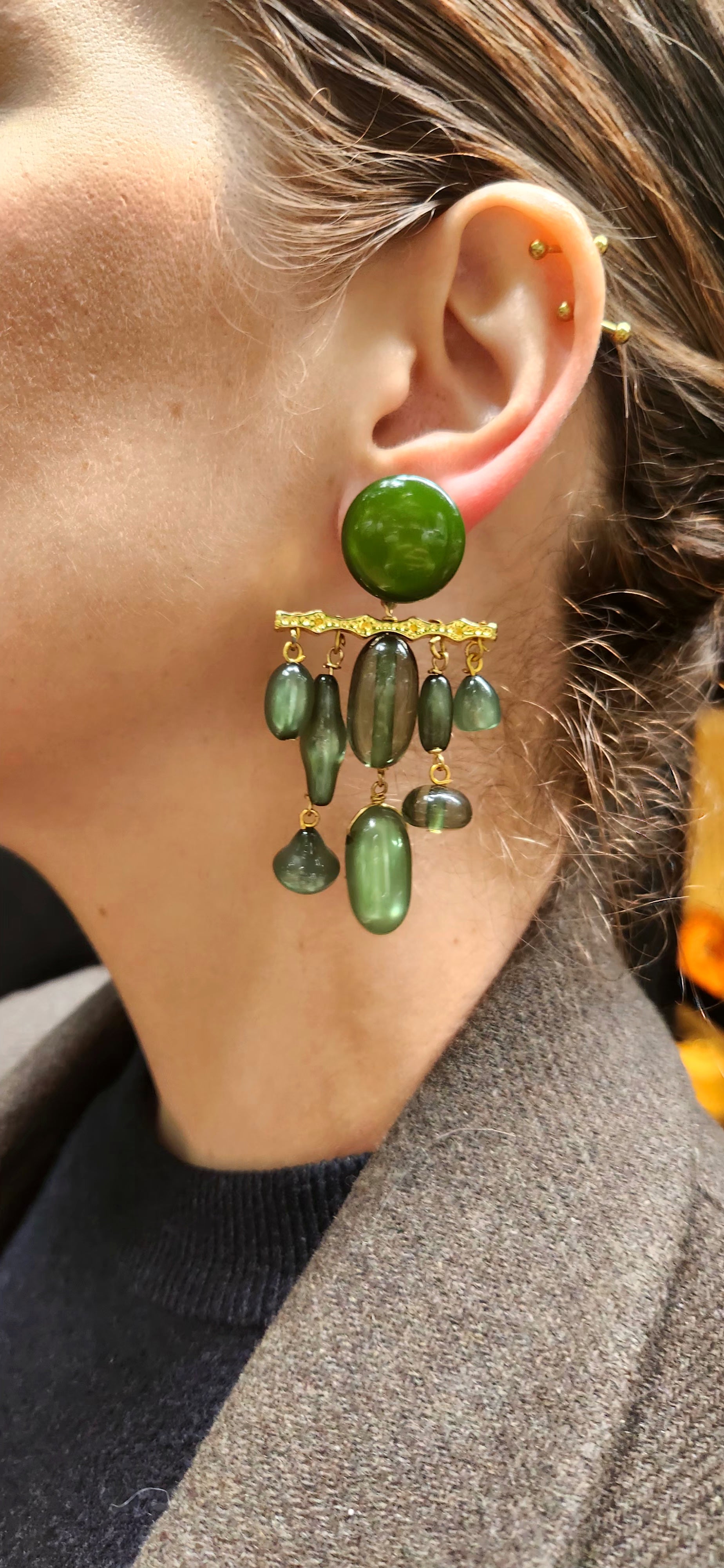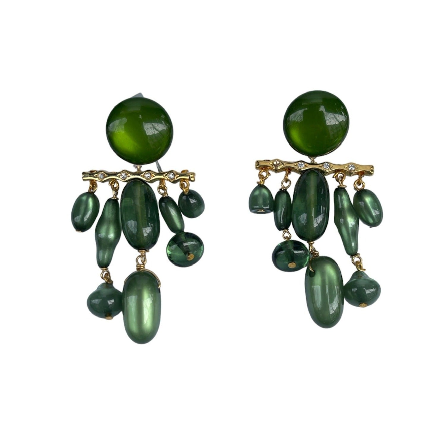 Elaboradda en resinas cápsula efecto cristal en color verde unidas por barrita dorada haciendo efectro chandelier