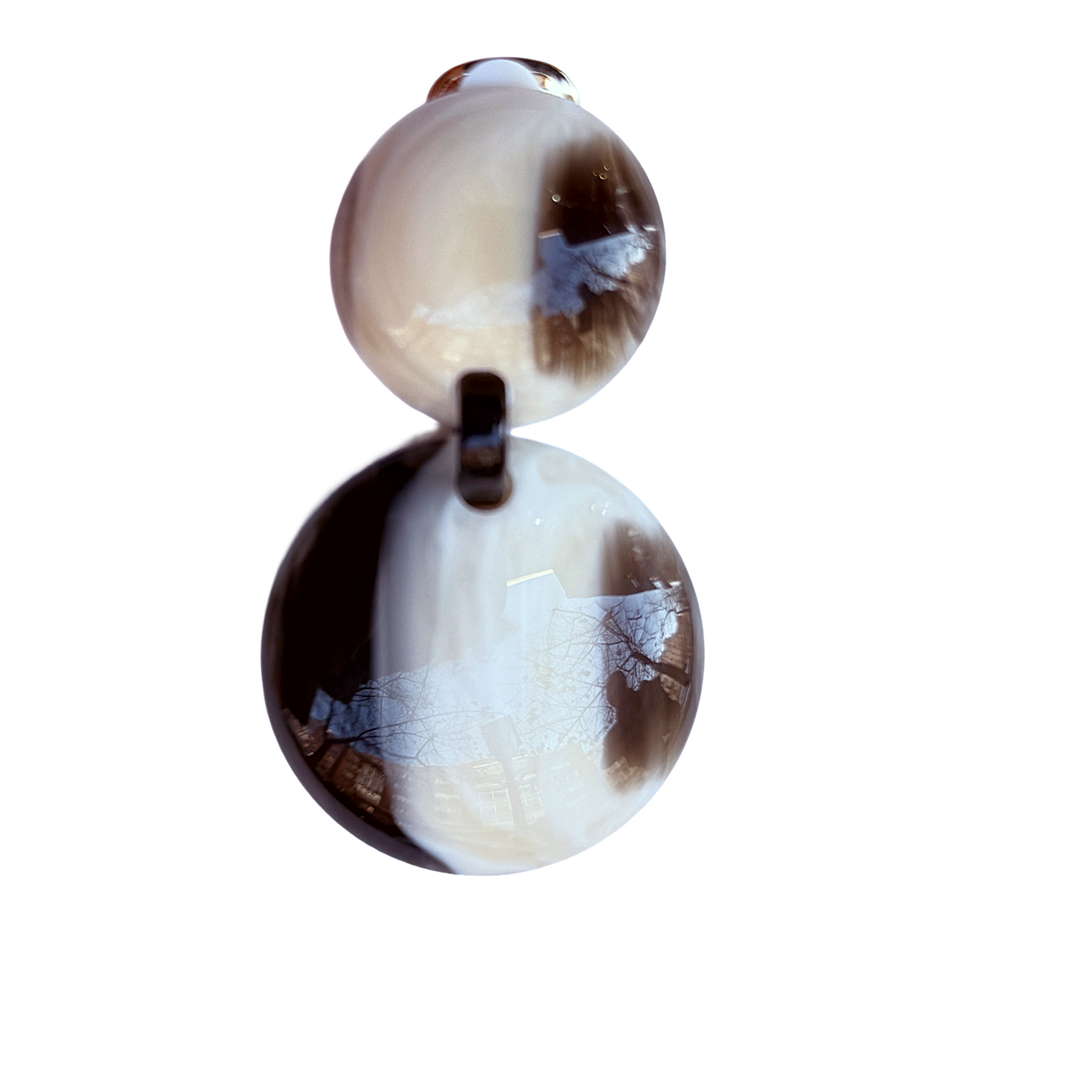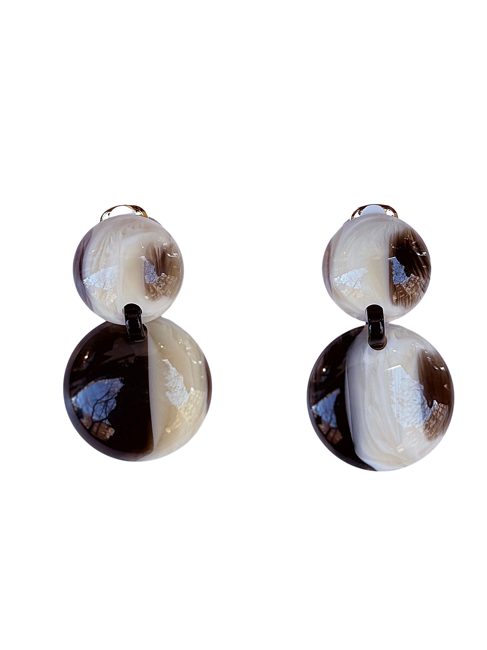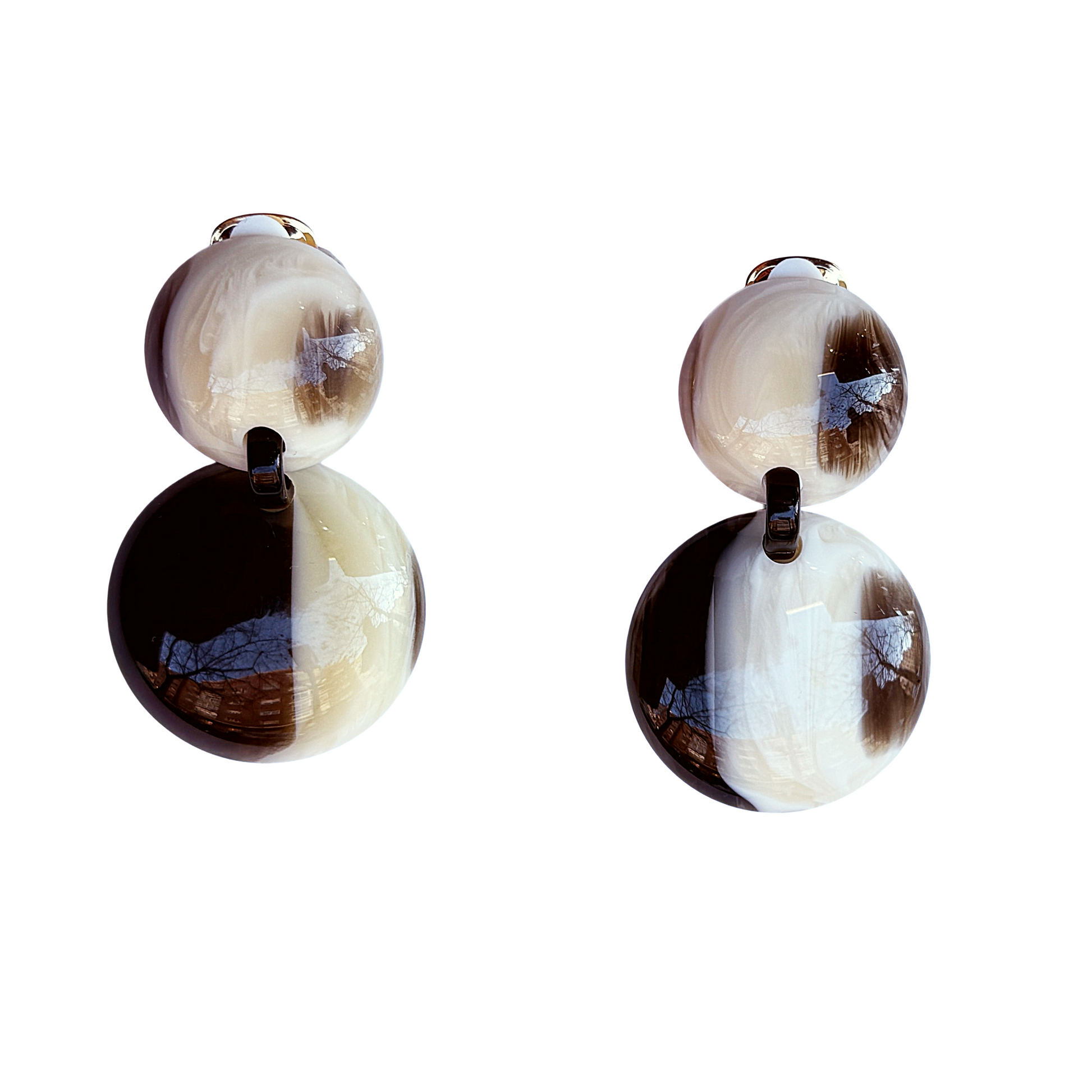 Su diseño de doble esfera presenta un delicado efecto marmolado en tonos beige y chocolate, con un acabado brillante que resalta la profundidad del material.