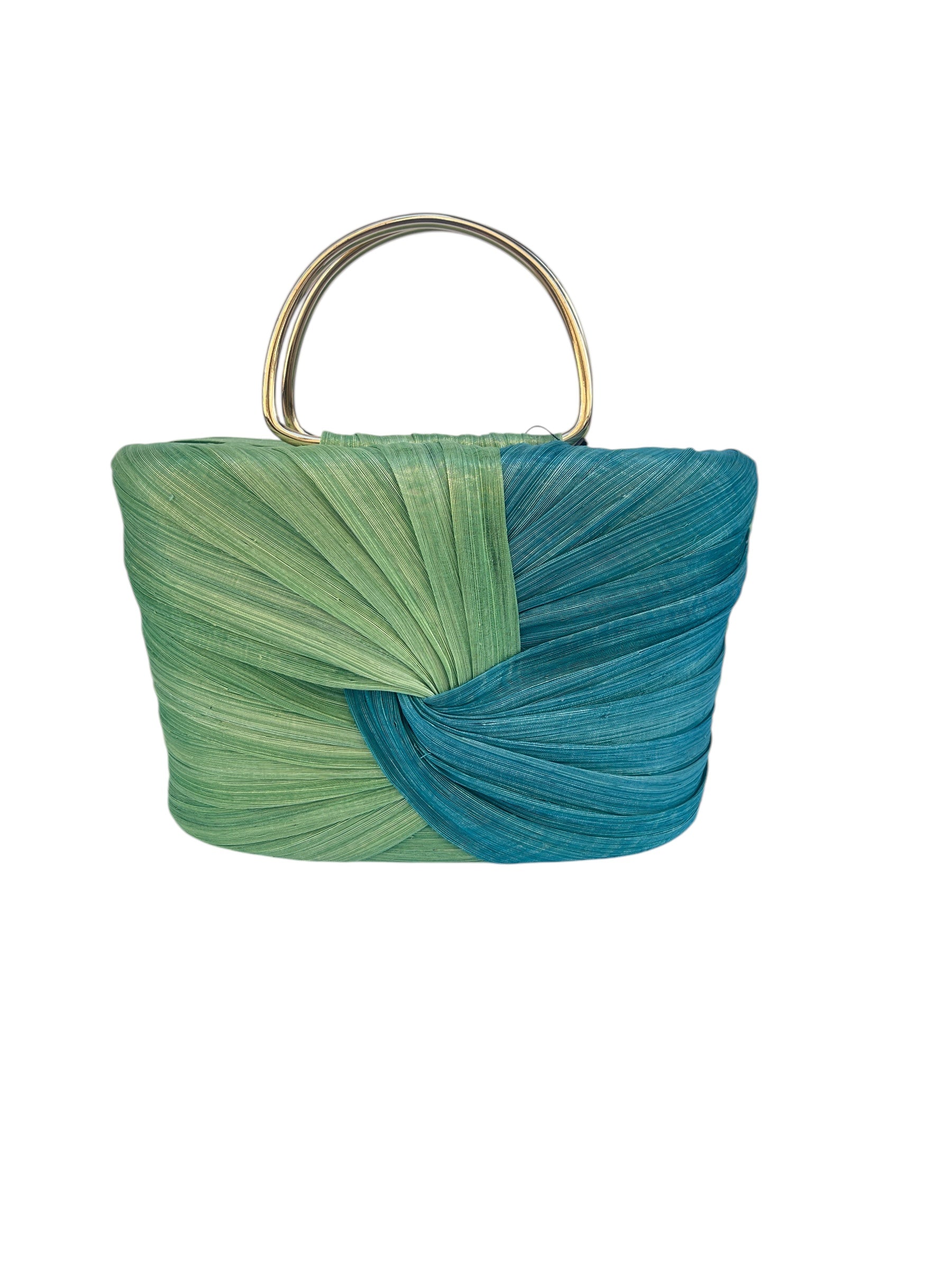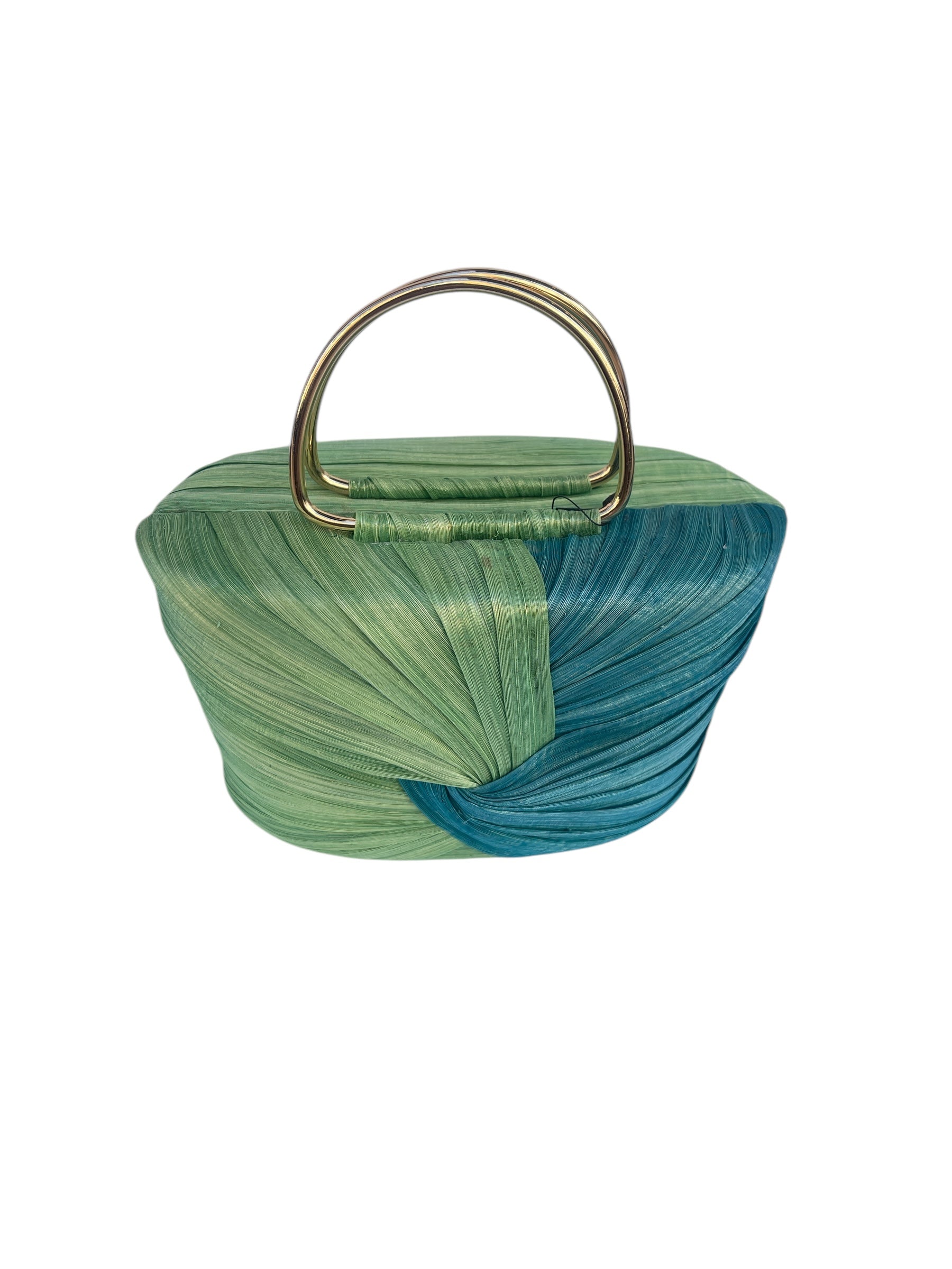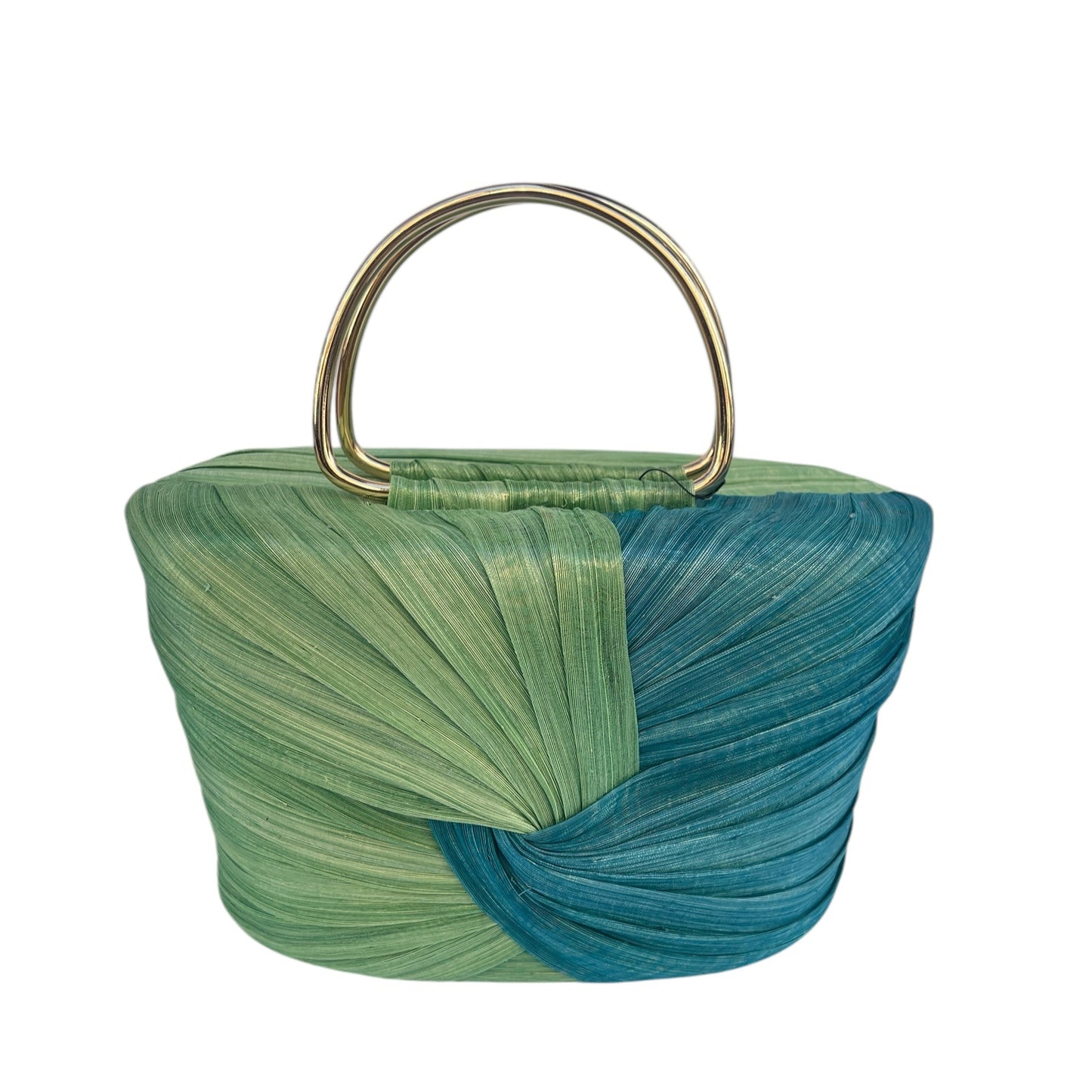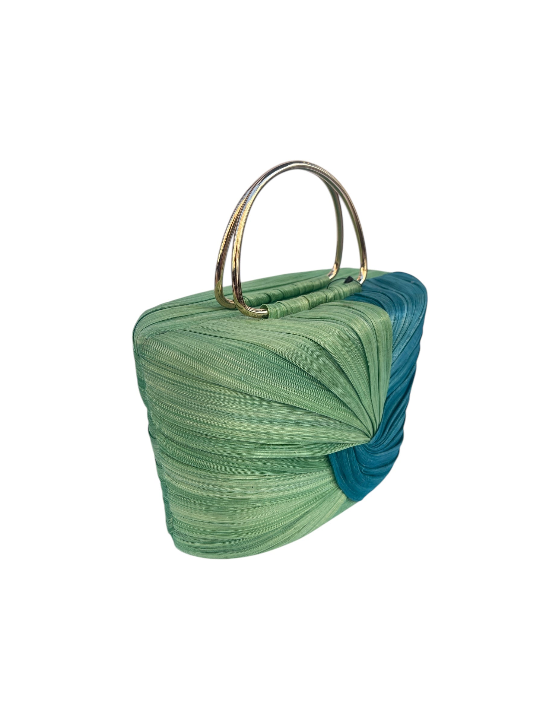 Precioso bolsito de fiesta elaborado en fibras naturales y con acabado drapeado efecto organza en colores verdes