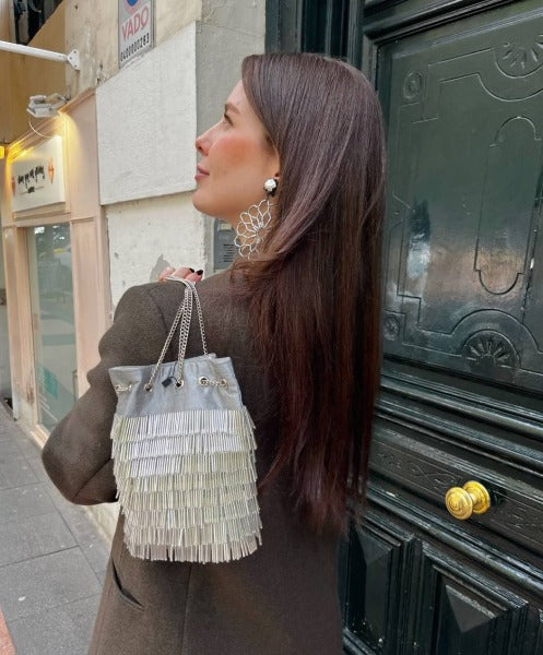 Original bolso de mano realizado en canutillo largo de cristal plateado y blanco haciendo divertidos y elegantes flecos