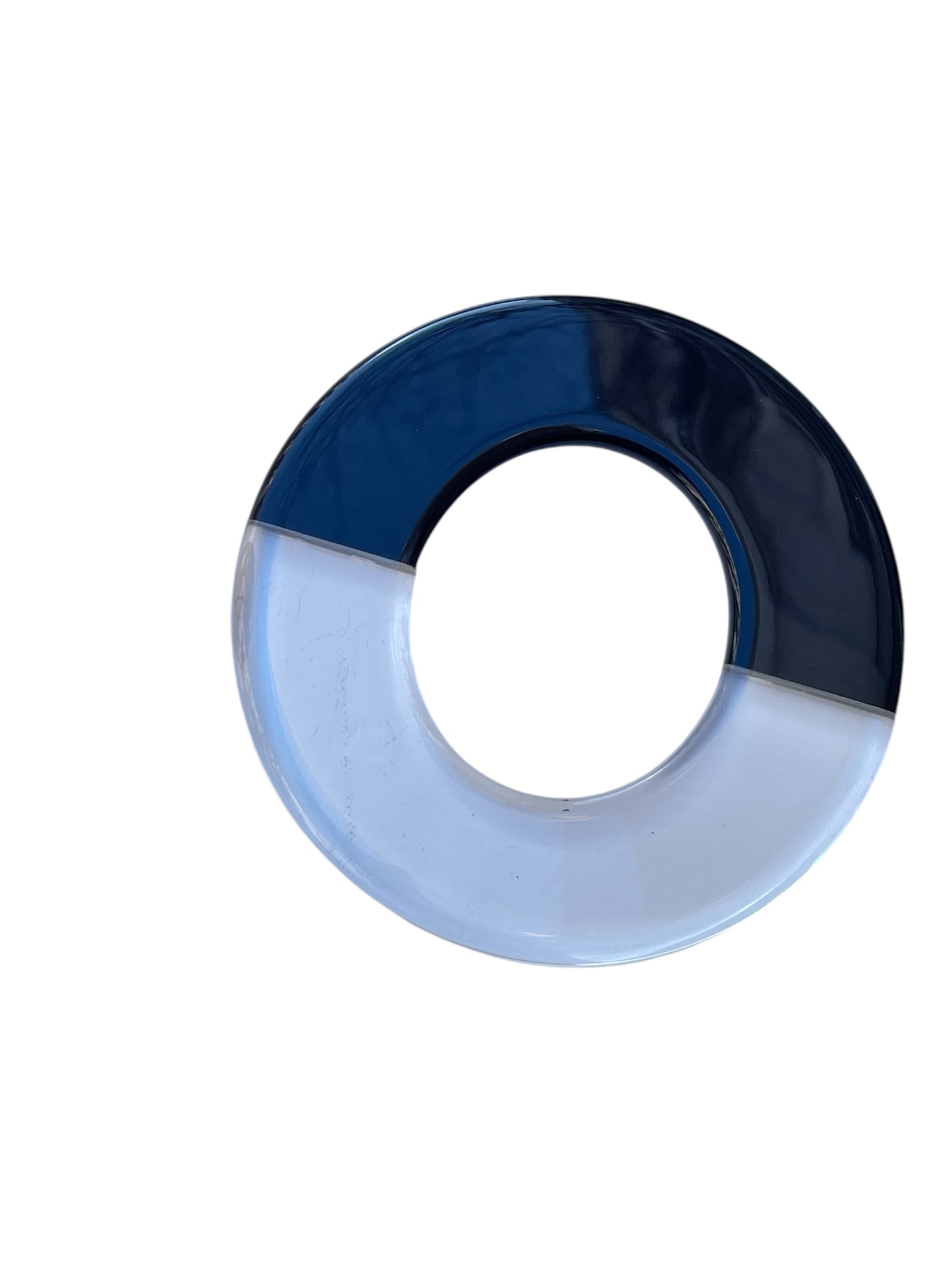 Este es un brazalete circular fabricado en metacrilato, con un diseño minimalista y moderno.