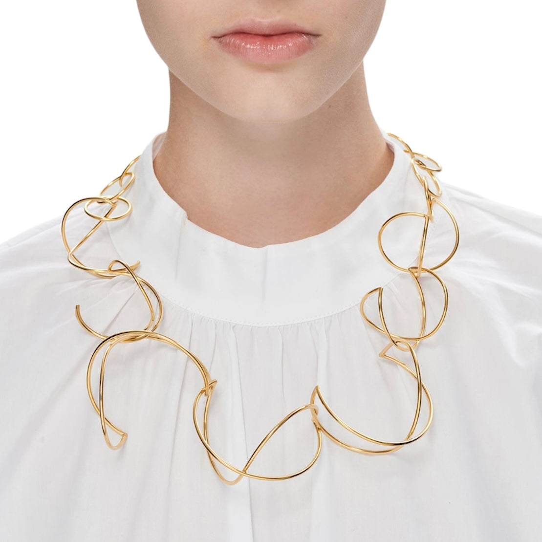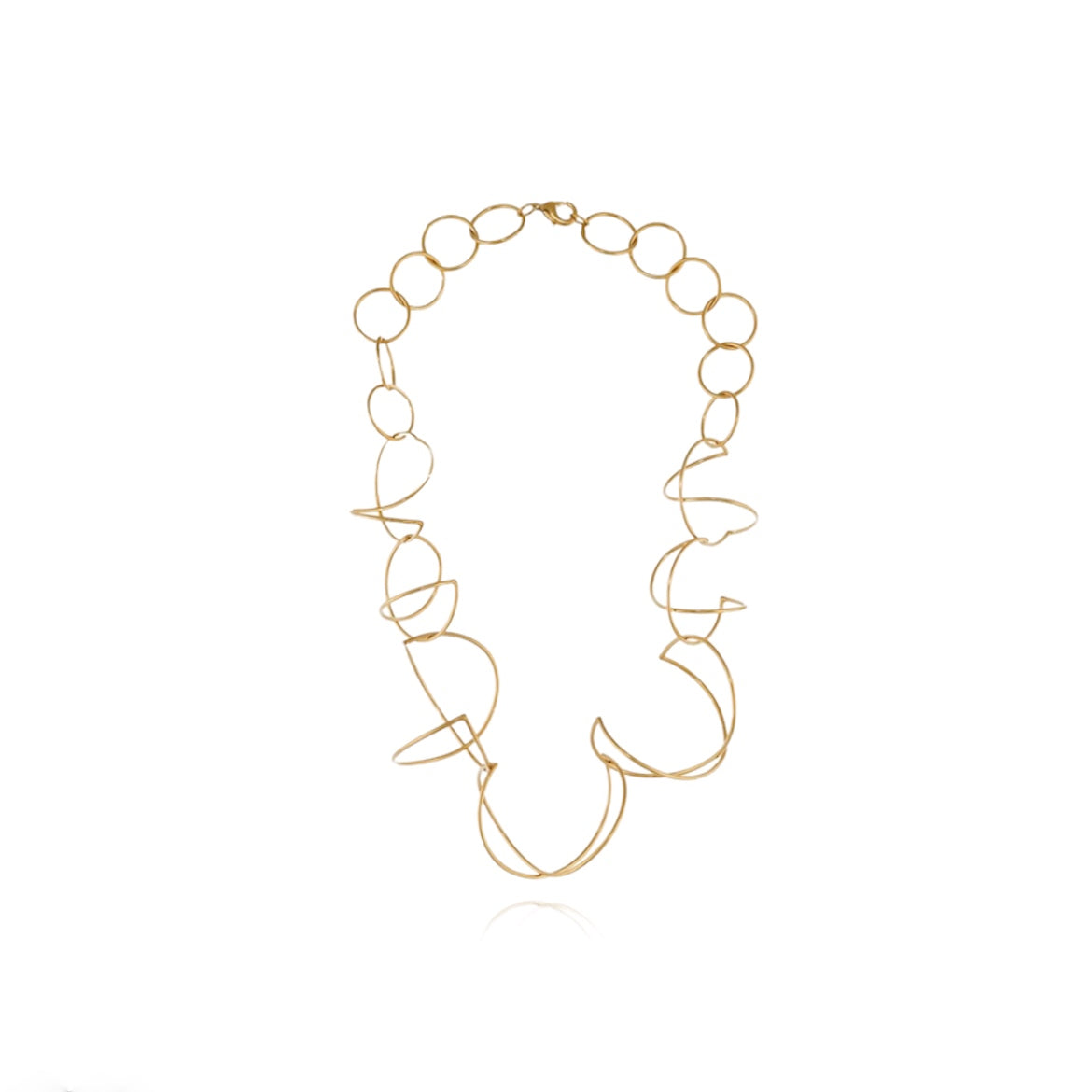 Este diseño cambia nuestro punto de vista sobre el concepto clásico del collar de cadena. Curvas ligeras, curvas que se cruzan, sensación de movimiento y ligereza; todos componen una pieza que guarda un equilibrio entre el estilo despojado y exuberante.