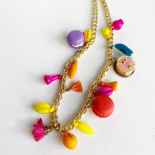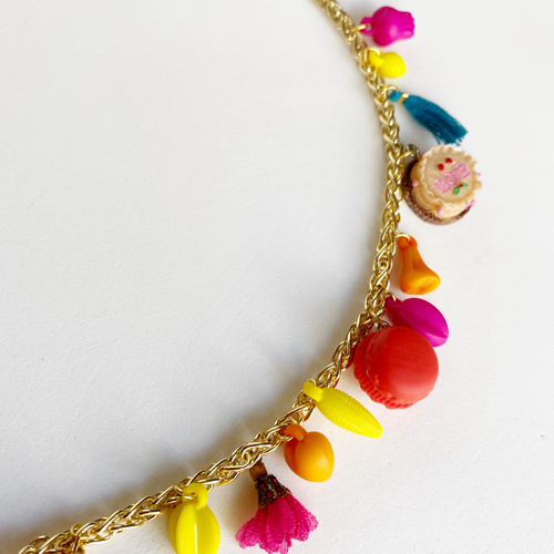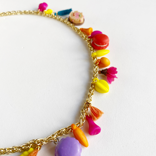 Collar corto de cadena dorada redondeada con mix de charms de resina multicolor.