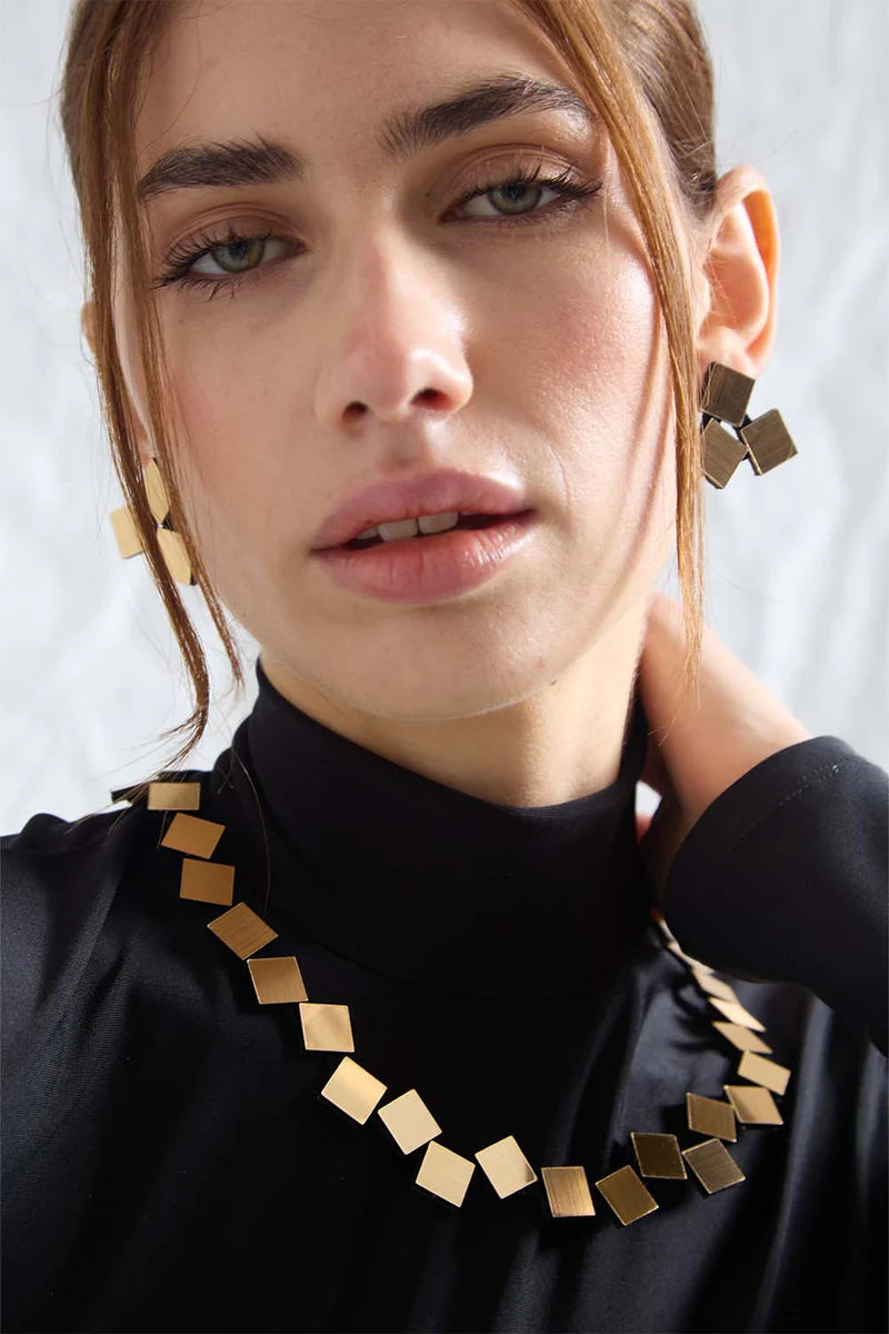 Este collar está elaborado en ante y acrílico metalizado. Pieza que llama la atención por su look distinguido.