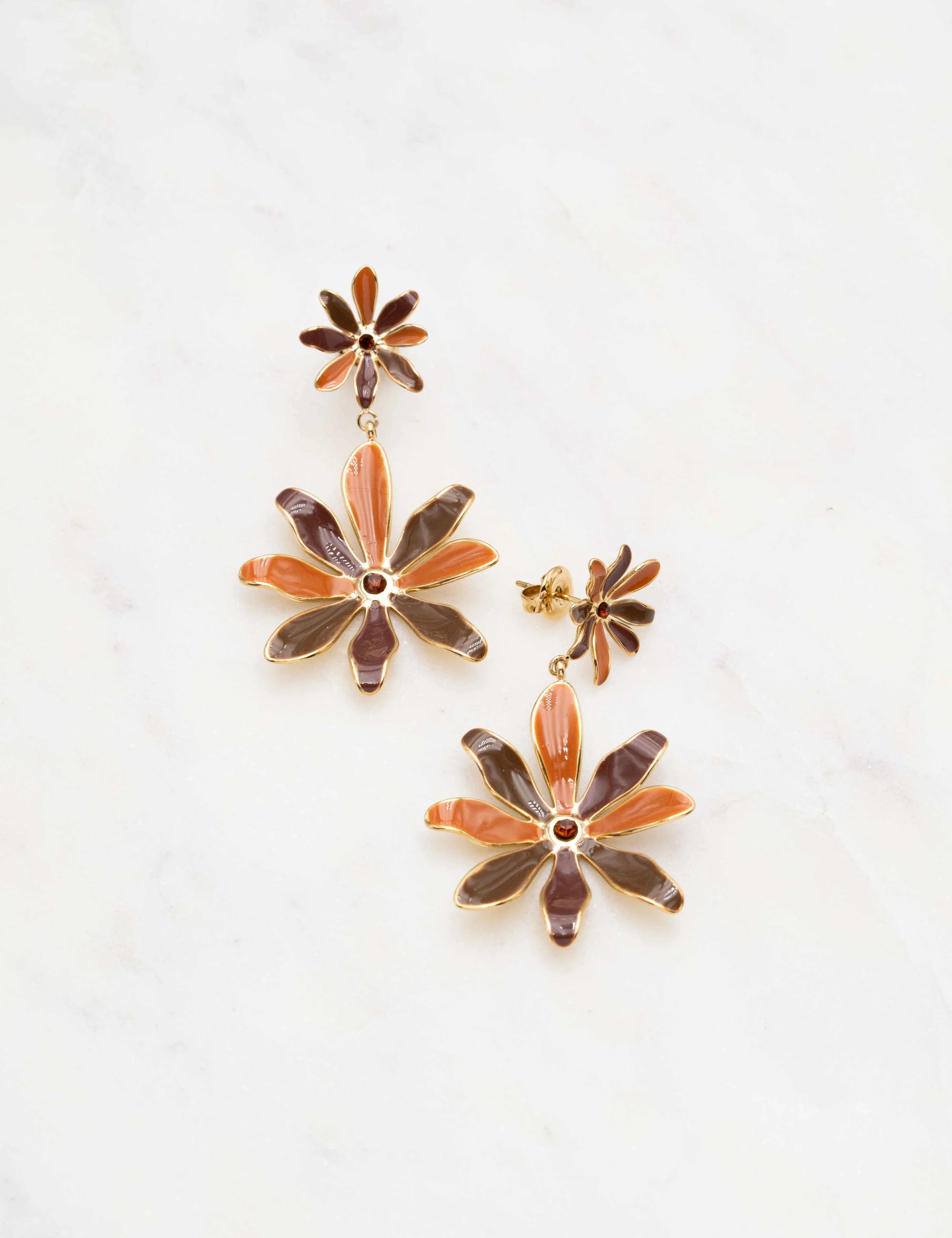 Pendientes de botón compuestos por dos piezas con un estampado floral esmaltado de colores decorado con una strass.