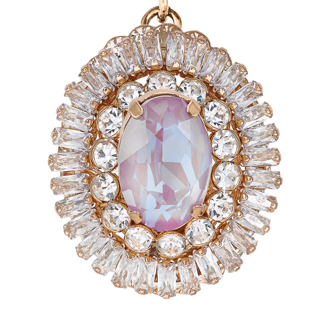 pieza sofisticada y luminosa que destaca por su diseño refinado y equilibrado. La composición combina un cristal superior en tono melocotón suave con un motivo inferior ovalado en lila iridiscente, rodeado por circones transparentes que aportan brillo y profundidad.