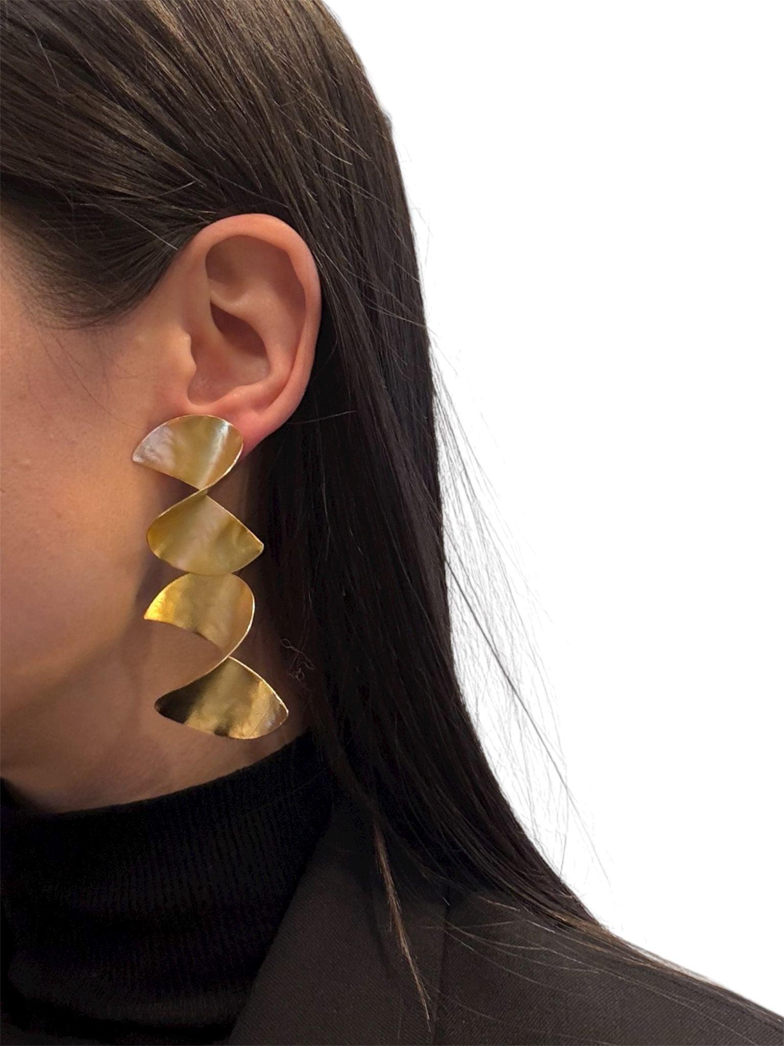 Pendientes largos de inspiración primitiva y orgánica, elaborados en latón con baño de oro de 18 quilates. Su diseño en forma de volúmenes curvos y martilleados crea un efecto escultórico que capta la luz y aporta movimiento al rostro.