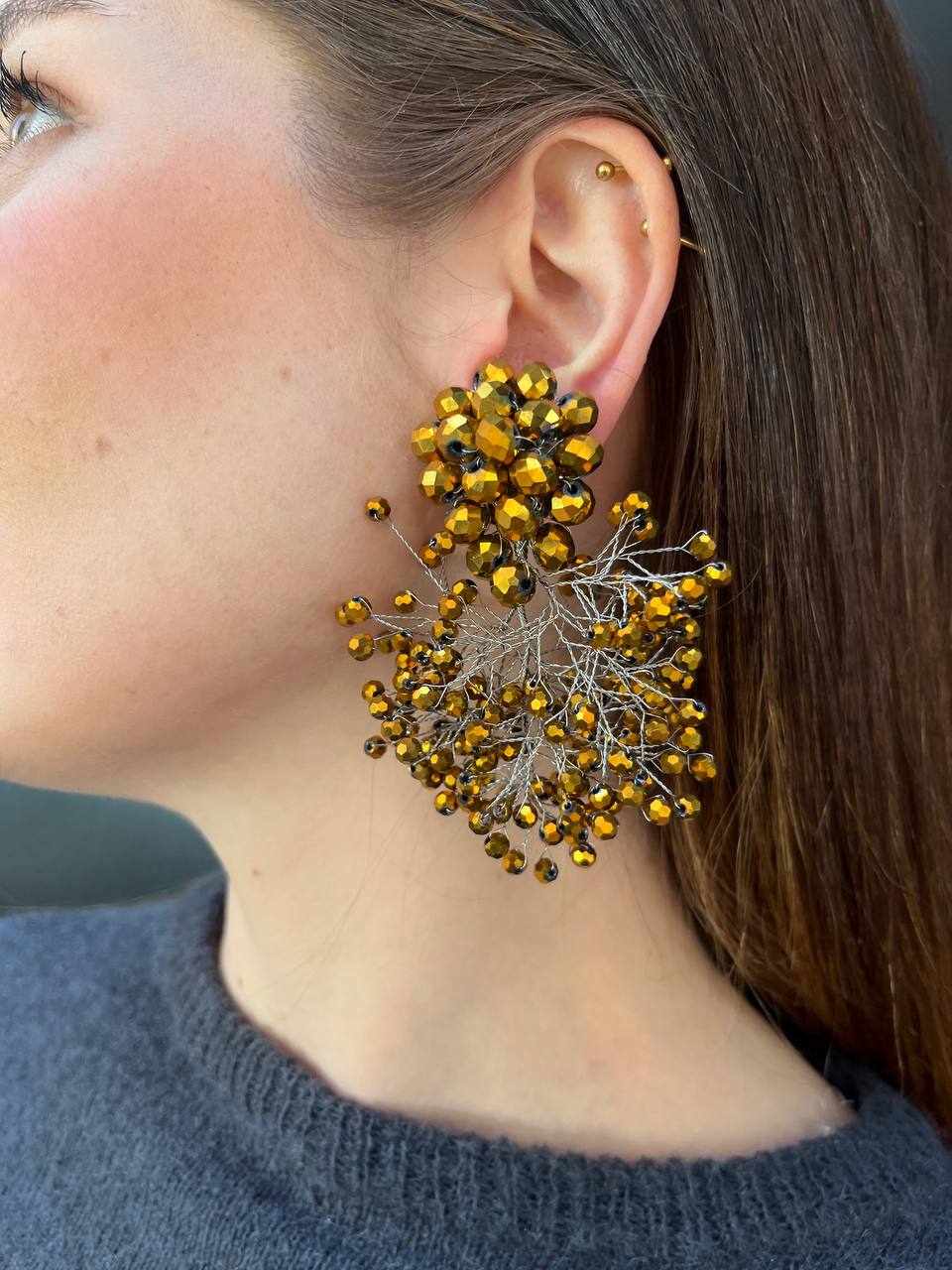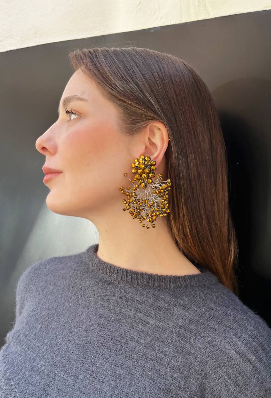 Modelo de pendientes tramados de cristal en pequeños dorados. Su ajuste es de clip. Quedan bastante pegados al rostro y son rígidos